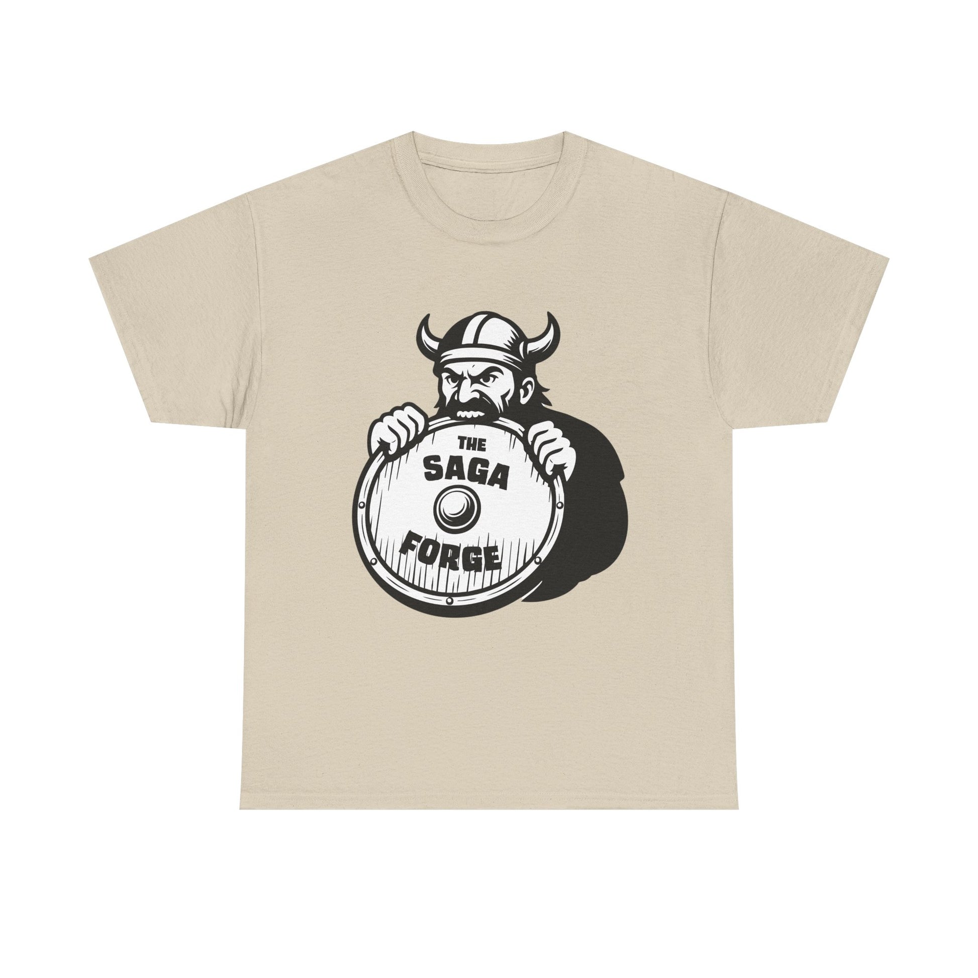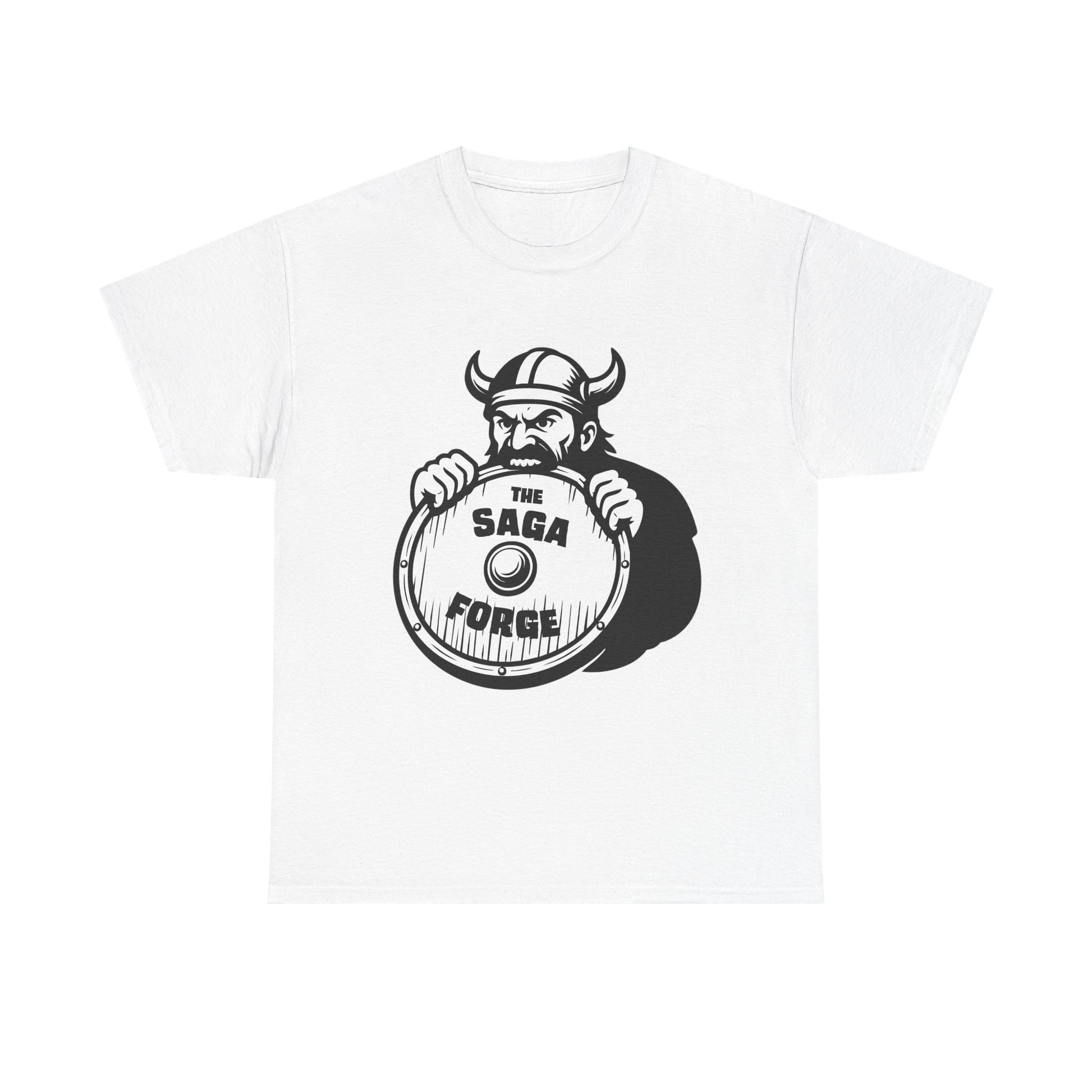 This rugged tee channels old-world lore with modern comfort. A bold, monochrome Viking illustration—helmeted and holding a round shield stamped “The Saga Forge”—sits center chest, giving the shirt a hand-drawn, tattoo-style look. The medium-weight cotton feels sturdy yet breathable, and the classic crew cut keeps the silhouette clean and wearable every day. Wear it to storytelling nights, small concert gatherings, or while tinkering in the garage; it anchors an outfit with a quiet confidence that nods to craft, lineage, and hands-on hobbies. The understated white background makes the graphic pop, so the art leads the conversation.